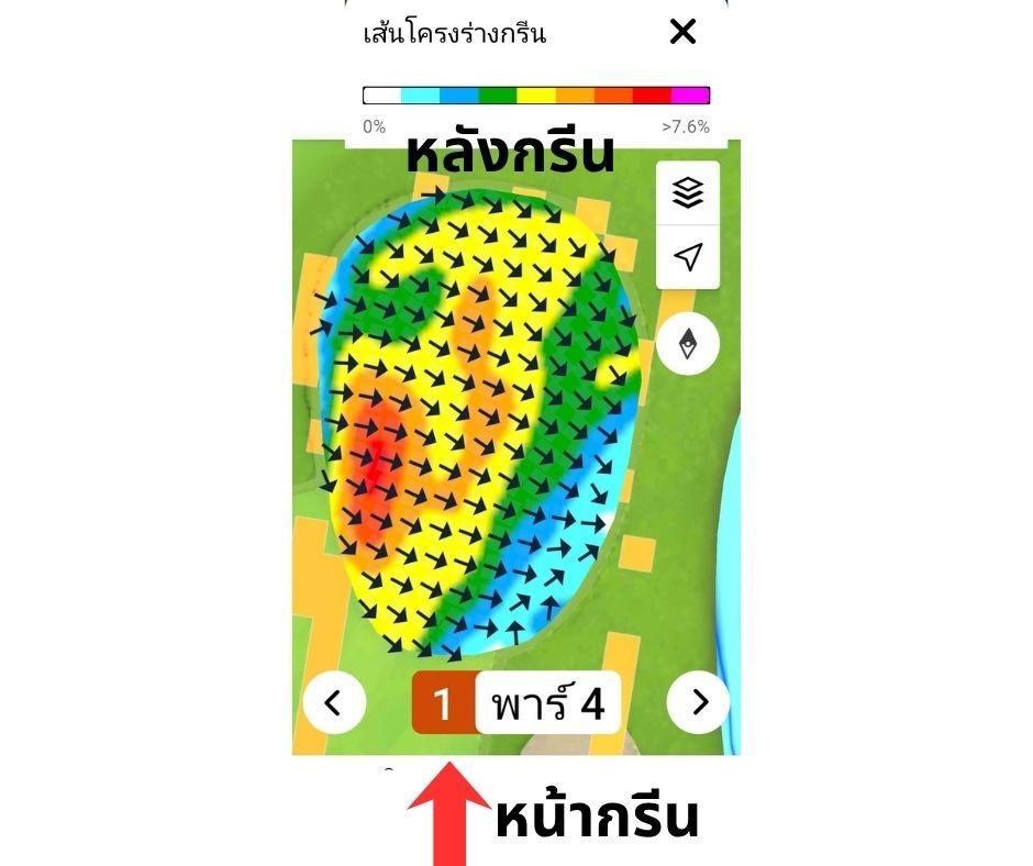 จากภาพ Green Contour ที่แนบมา เราจะเห็นลูกศรและสีที่บอกความลาดเอียงของกรีนได้ชัดเจนครับ