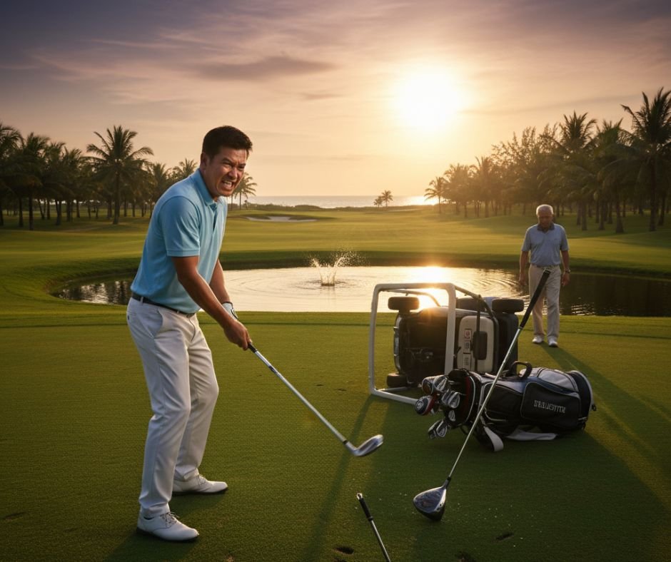 ลูกกอล์ฟเลี้ยวขวาหายไปในน้ำแบบไม่ได้ลุ้นเลยครับ วินาทีนั้นเหมือนมีอะไรบางอย่างในหัวผมระเบิดออกมา ความหงุดหงิดที่สะสมมานานมันปะทุขึ้น ผมขว้างเหล็ก 9 ในมือใส่รถกอล์ฟเต็มแรง!